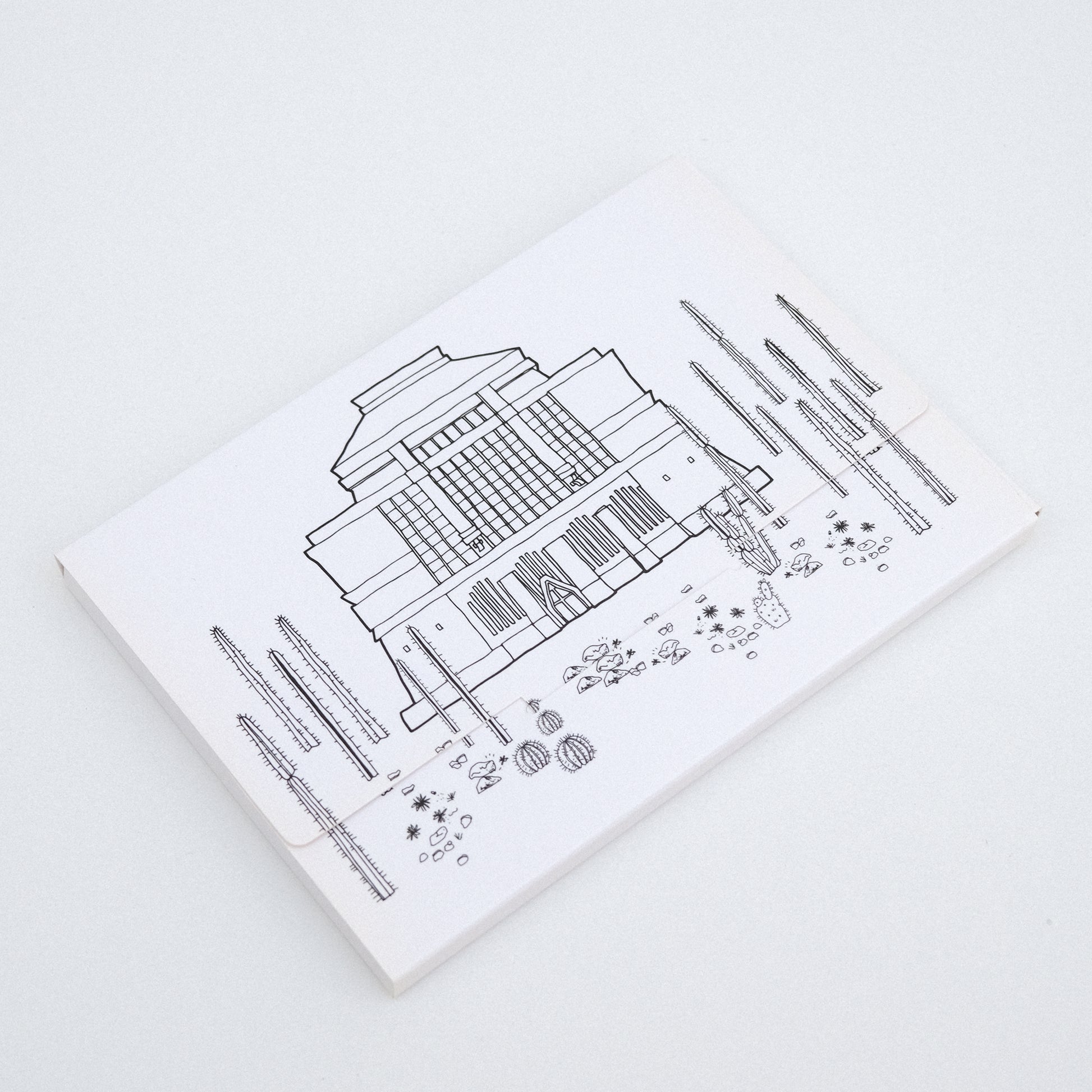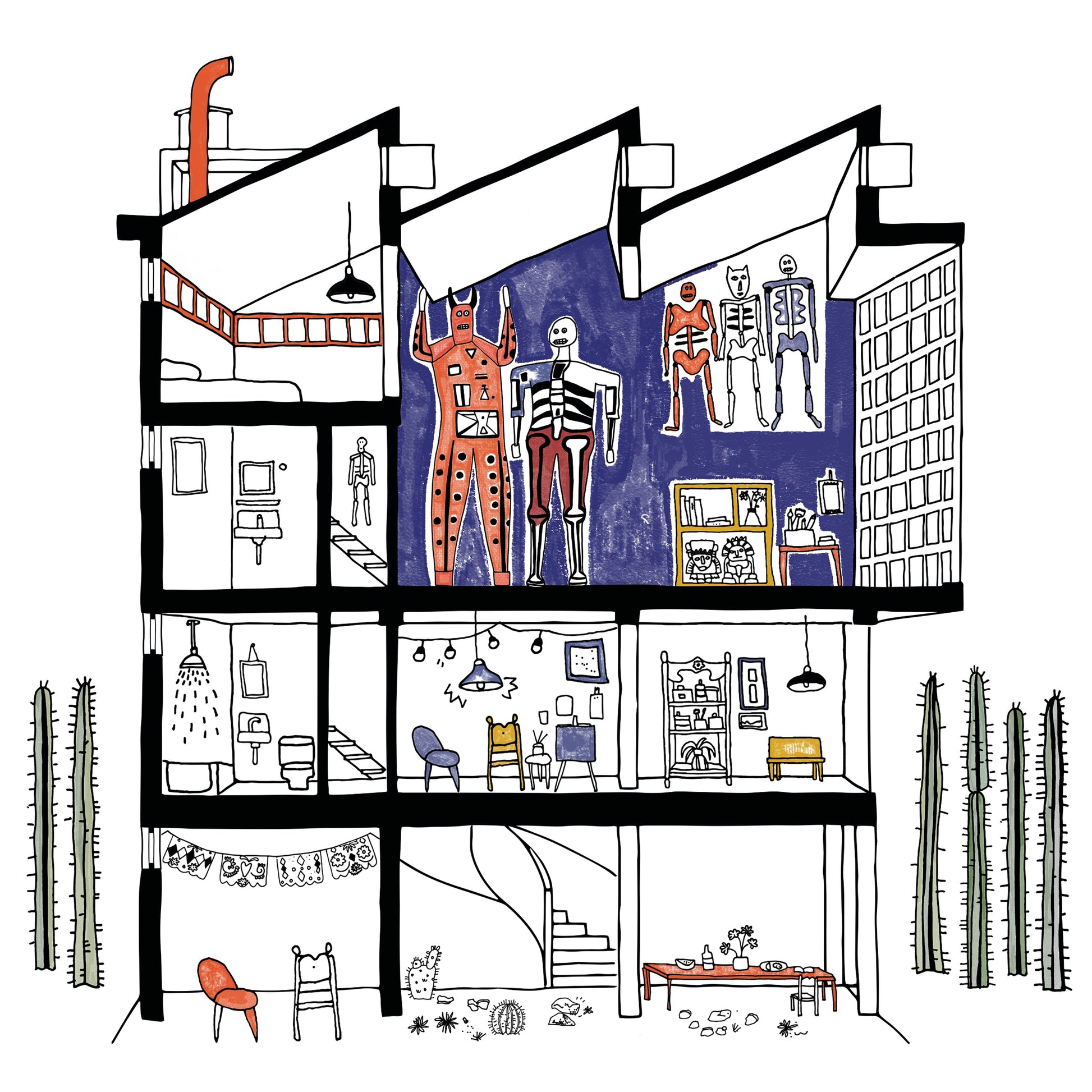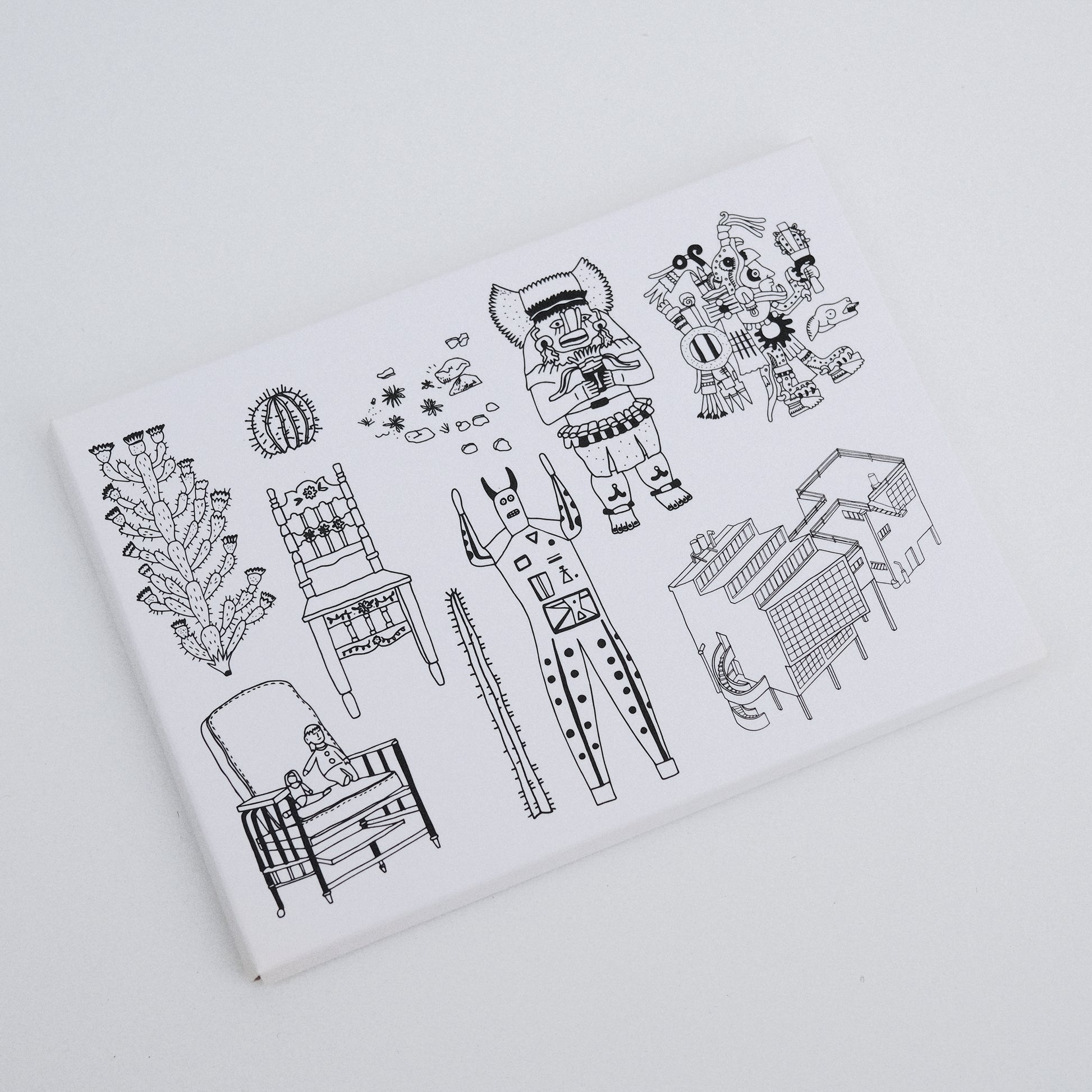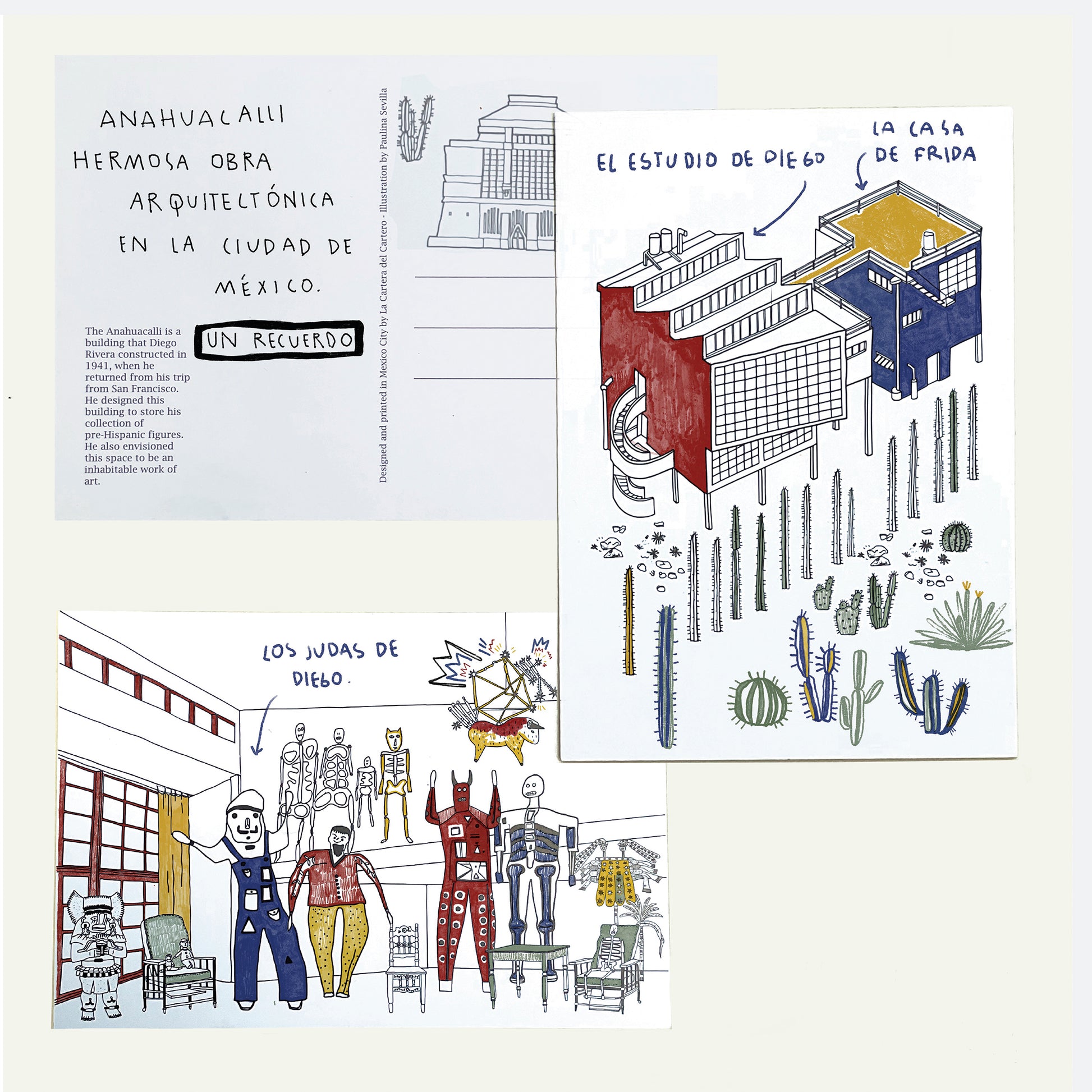 En 2022 SFMOMA (San Francisco Museum Of Modern Art) Museum Store, me invitó a hacer una colaboración para la exposición: Diego Rivera’s America. Como arquitecta, mi forma de aproximarme al proyecto, fue ilustrando los edificios que el artista habitó en la ciudad de México: el edificio del Anahacalli, un templo para el arte que Diego diseñó en los años 50 y su casa estudio del barrio de San Ángel, en donde vivió con Frida Kahlo. También me pareció emocionante ilustrar todo el universo de cosas que ocurre dentro de estos espacios: las figuras de judas que coleccionaban, las figuras prehispánicas, sus objetos de uso cotidiano y de dibujo. En esta caja puedes encontrar una serie de diez postales para compartir con tus amigos y tu familia el universo de Frida y Diego.